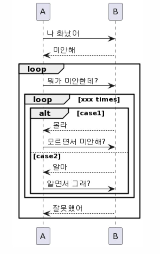 - alt/else : if/else와 같은 분기 처리 표현(조건이 여러 개일 때 표현)